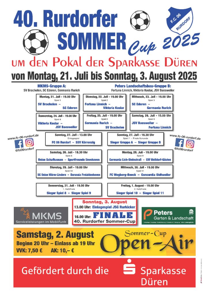 Am morgigen Montag, 21.07.2025, ist Anstoß im Rurdorfer Rurtalstadion für den 40. Rurdorfer Sommercup. Das Auftaktspiel um den Pokal der Sparkasse Düren bestreiten der SV Brachelen und der SC Ederen. Anstoß ist wie gewohnt um 19.00 Uhr.